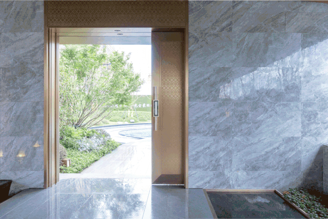 透过接待大堂的镂空面,展现在人们面前是一幅真实的自然画卷,强列的空间纵深感表现出丰富的景观层次。观者从前厅穿行而过,庭外林水交错、风景怡人,庭内涌泉阵列、浮光掠影,犹如人在画中游,引人入胜。