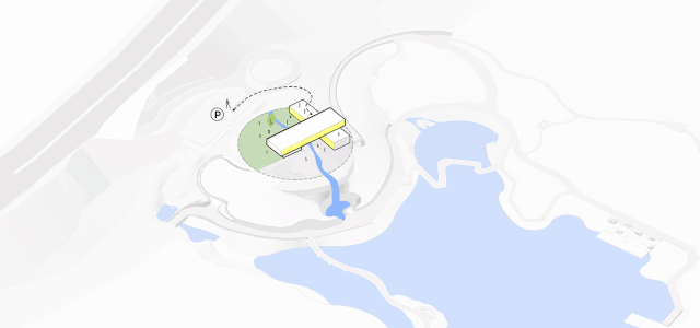 本案选址在一个距离道路60m的小山丘上,与道路有12m高差且距离湖面30m。设计从解决高差入手,将人流从主路平缓引入,同时强调观景面最大化。