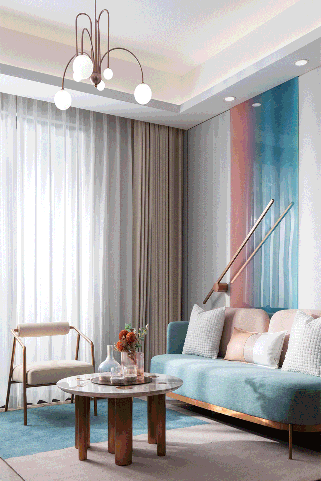 室内空间整体格调明快柔和,造型线条简洁,结合金属材质做点缀,以细腻手法来演绎轻奢风貌,在静谧清纯中似乎可以不经意间触碰到内心深处最柔软的角落。