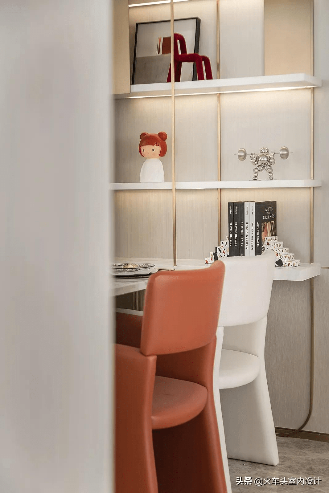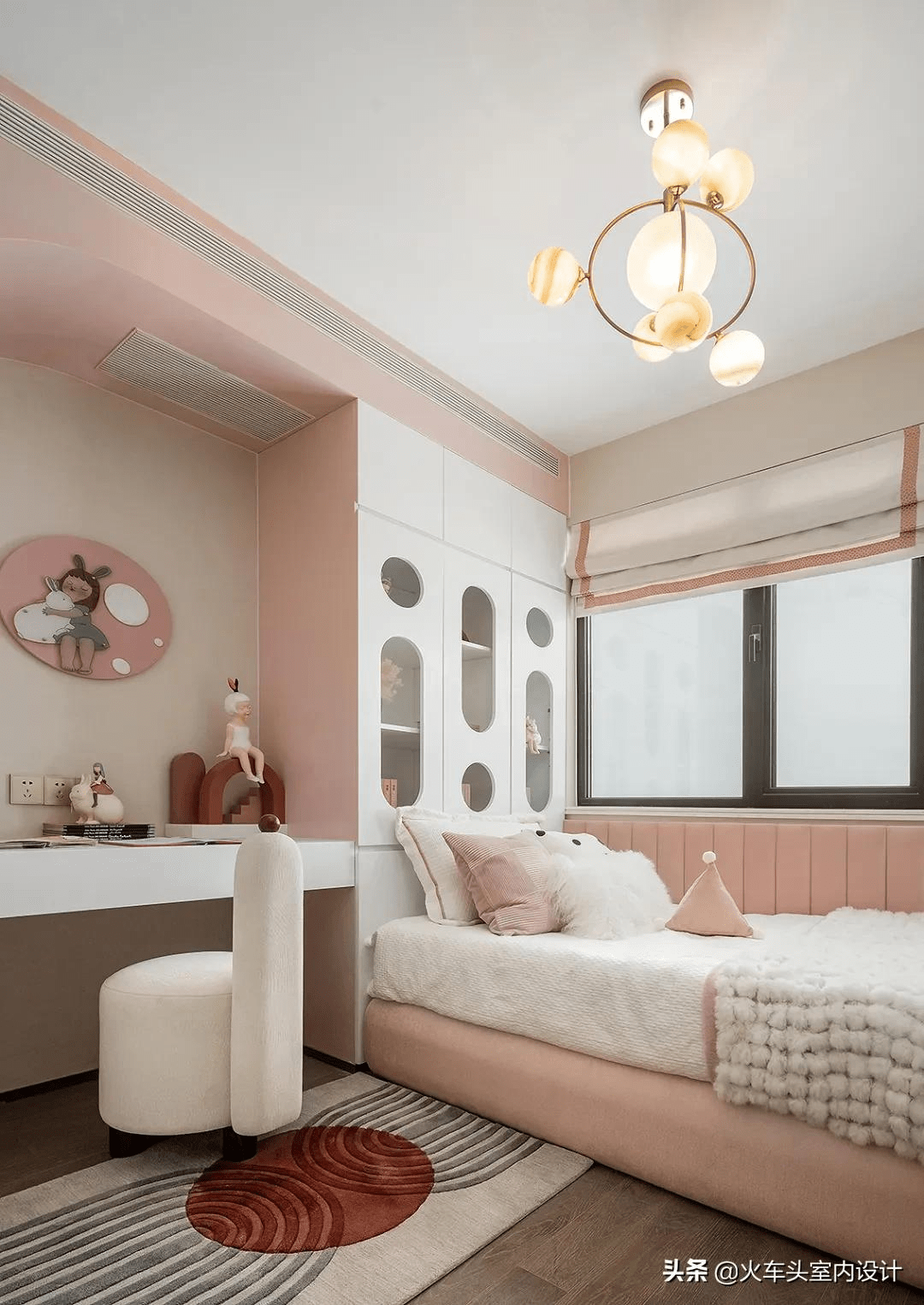设计师赋予此间的是女孩温柔可爱的性格,圆形几何语素的地毯和灯具、生动活泼的摆件与挂画,在浅粉与白色的色调烘托下,氤氲出女孩的浪漫与纯真。