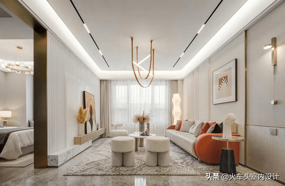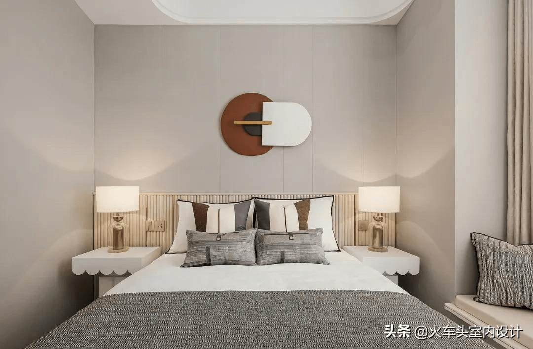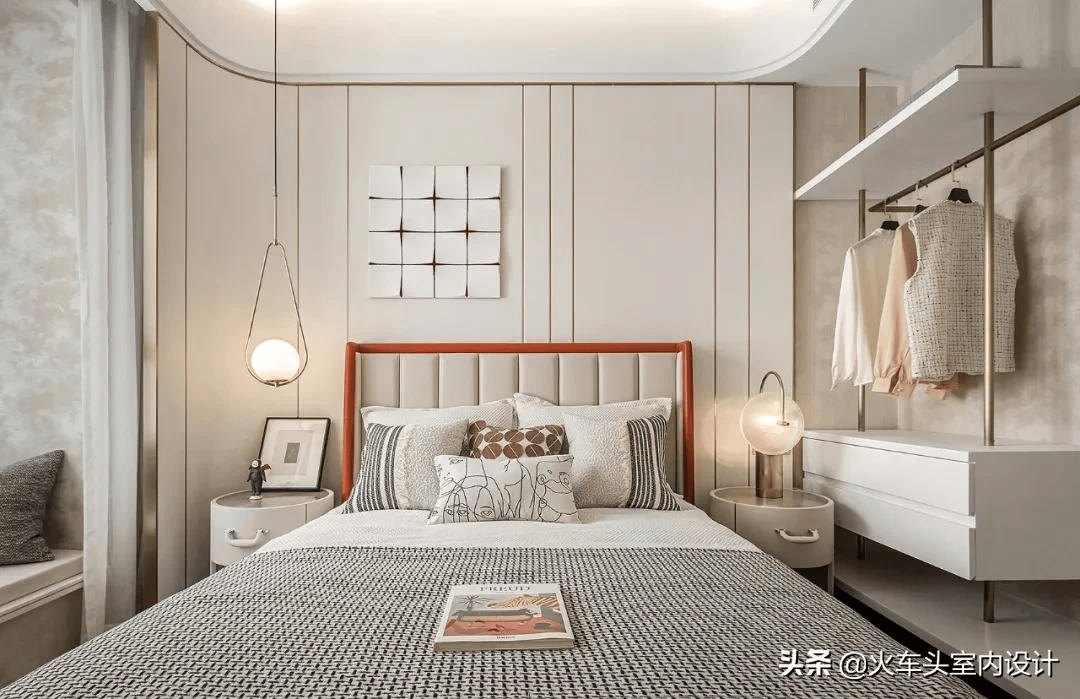 设计在空间中引入当代简约的美学精神,浅棕与米白的低饱和度搭配,为主卧空间清新淡雅的风格定调,加之少许朱红色的调和,勾勒出多元的设色层次,令空间散发着和谐优雅的韵律。