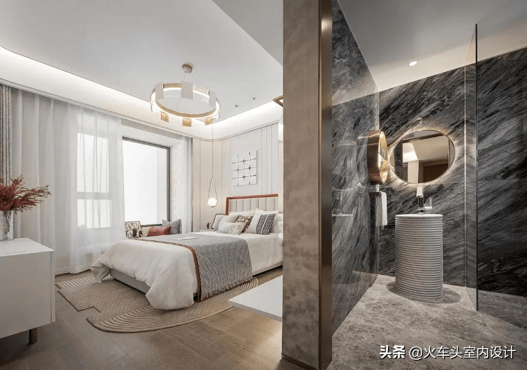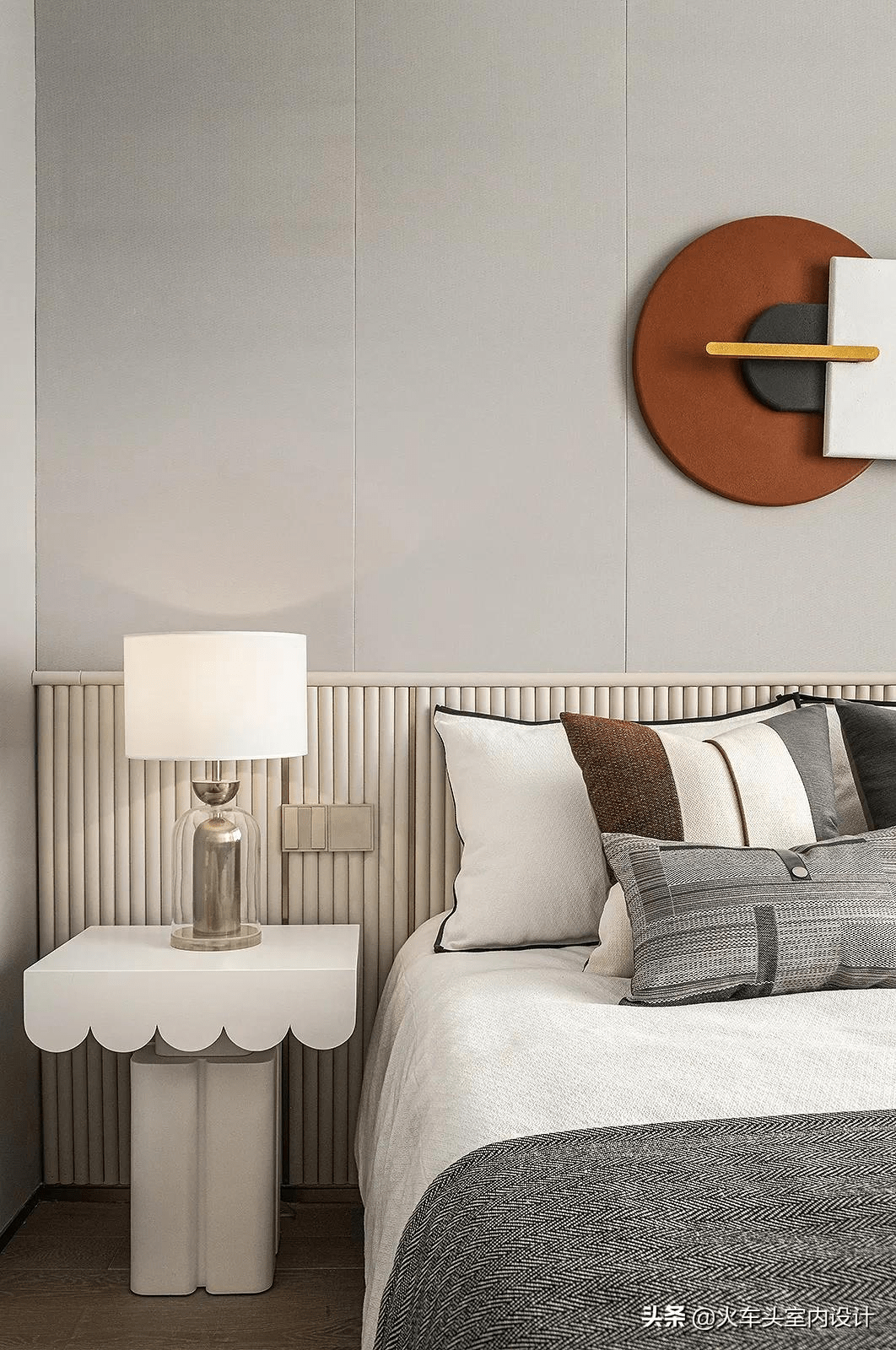 在次卧的设计中,灰白二色的经典搭配,铺陈出沉稳的空间气质。几何语素的墙面装饰、波浪纹路的台桌、轻盈灵巧的灯饰,这些物件的点缀,均构成几笔微妙的渲染,洋溢着当代都市美学的生活气息。