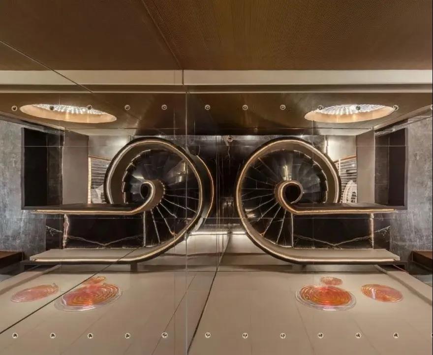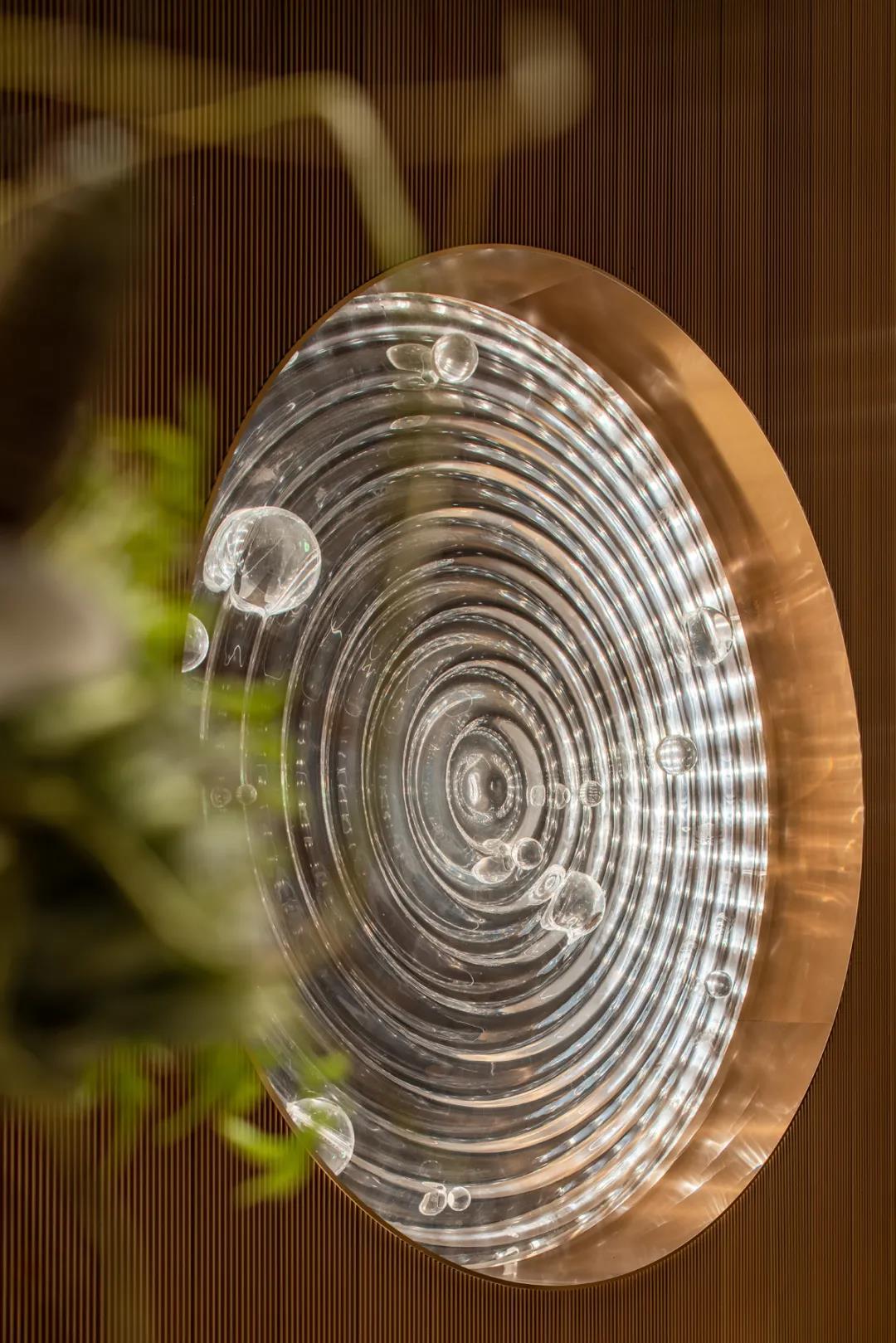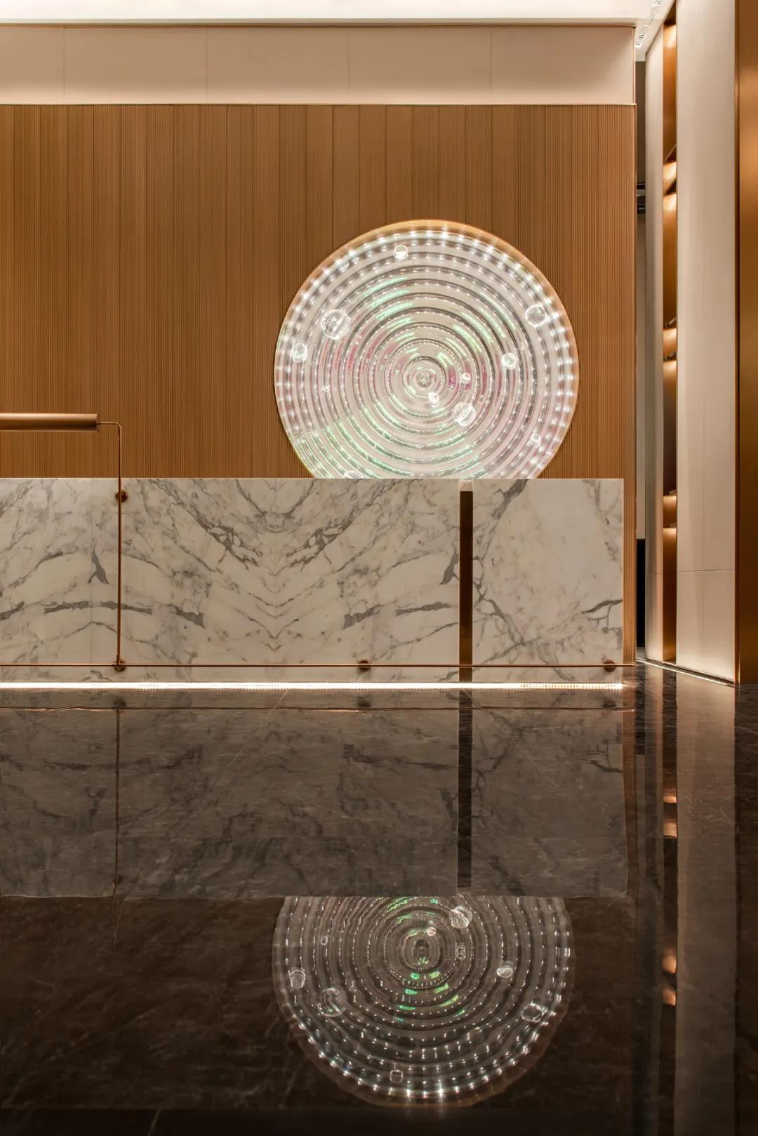 从屋顶坠下的层层圆环,在灯光的照耀下闪耀着光泽,如明月渐渐升起。 地面哈瓦那系列的镜面视觉,拟风吹起海面千层浪,月光倾洒于海面,波光粼粼,泛起阵阵涟漪,营造出了舒适怡然的氛围。