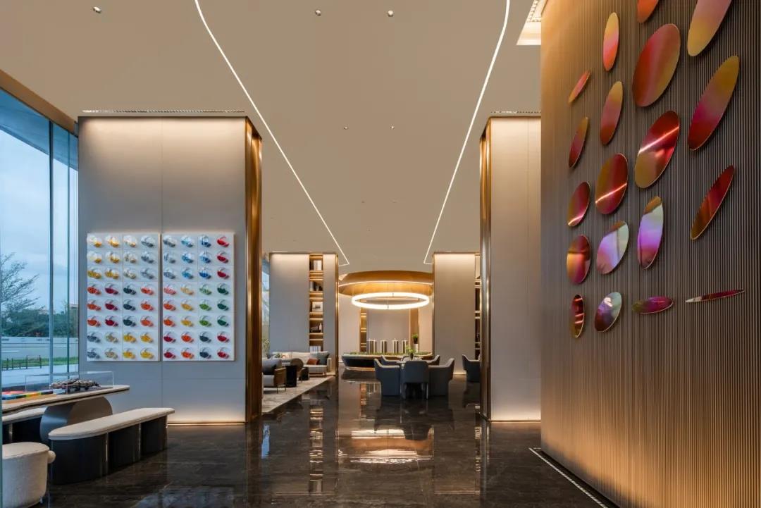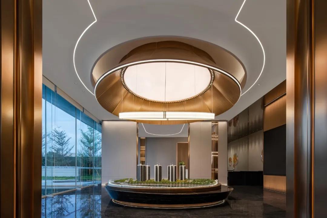 项目信息 INFORMATION 项目名称 / 保利招商锦上花园 项目地址 / 广东东莞 项目设计 / 尚诺柏纳空间策划 设计面积 / 1450㎡ 项目用砖 / 哈瓦那系列 本案以“日初、夕落、月升”为线索,串联了自然万物的美,从白昼光芒初生,到正午阳光正盛,再到傍晚惬意随性的淡淡光芒……光影虚实交织,在空间演绎从白昼到黑夜的都市节奏,亦表达了对都市生活之美的歌颂。 哈瓦那系列主要为售楼中心地面用材,哈瓦那原石外放大气的纹理,融入高级灰,营造沉稳大方的空间氛围,有大海的力量感,彰显情怀和格局。在日升日落的缱绻光影下,将空间质感映照其中,带来戏剧性的美观效果。 01. SUNRISE 日光初现 一年之际在于春,一日之际在于晨。随着第一束光的降临,新的一天拉开了序幕。 缓缓步入前厅,开敞宏阔的空间映入眼帘。如日光初现,晨露落于水面泛起涟漪,层层荡漾,以亚克力的材质定格于此,让空间颇具动感,引人入胜。