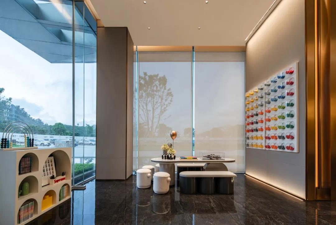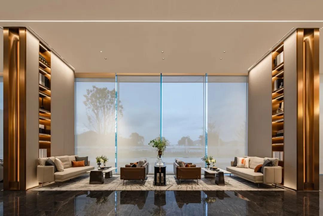 展厅内部动线明晰,看似随意却饱含精心规划的流动线,让人流连忘返于其中。几面曲直各异的格栅屏风,若隐若现中捕捉着光影,穿行其间增添了几分神秘感。 步入沙盘区,便是进入到空间光亮最盛的区间,使得视觉上更加开敞。