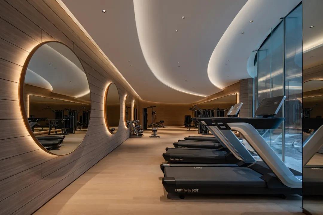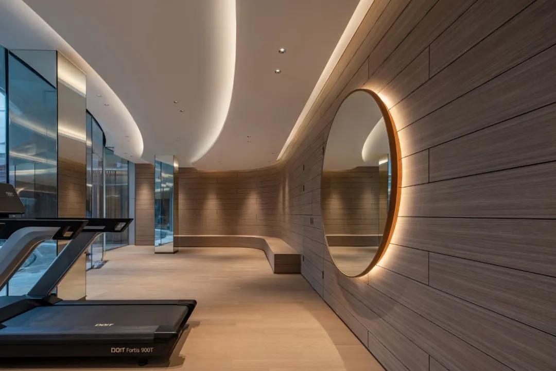 健身室摒除繁琐的装饰和复杂的造型,利用线条的组合、拼接、变换,让整个空间看起来更富设计感与运动感。弧形的线条,利用大面积的落地窗,引入自然光线,在视觉上更是拉长了空间的距离。