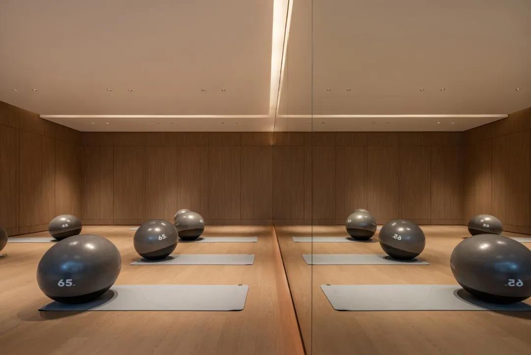 相邻的瑜伽室通过木质材料自身最原始的质感,将空间的淳朴与静谧自然释放,平静自然。